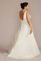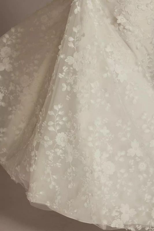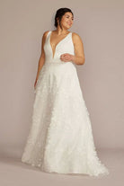 The elegant crepe bodice on this wedding dress is detailed with tank straps, a plunging V-neckline, and an open V-back, while the chiffon A-line skirt is topped with dozens of 3D floral appliques