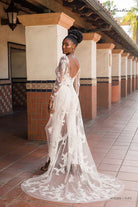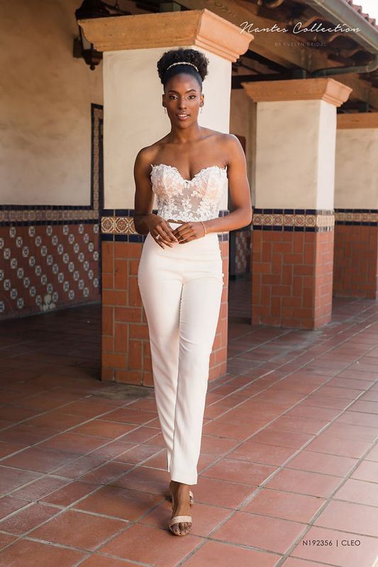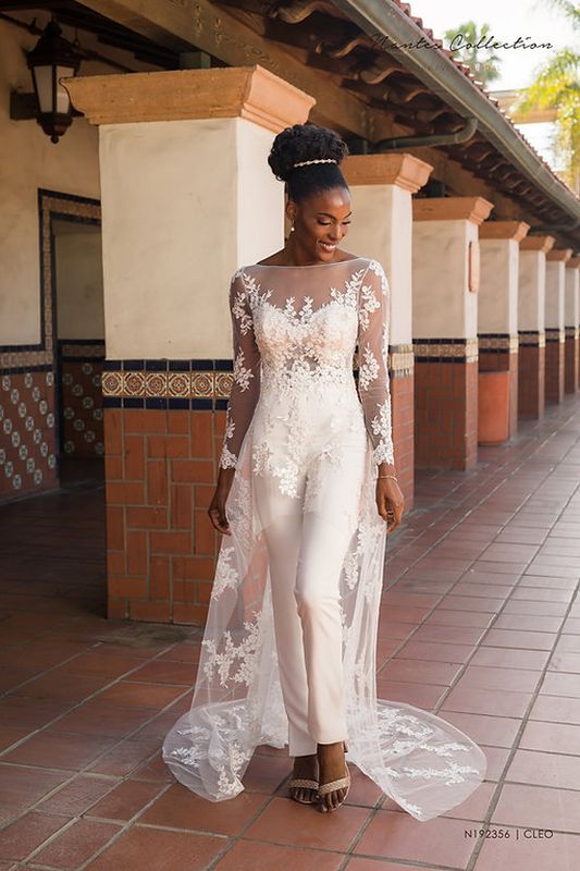 Sophisticated three piece ensemble with lace crop top, fitted crepe pants, and topper. The sweetheart neckline sheer floral lace crop top is paired with tailored crepe pants. The separate sheer tulle long topper features a bateau neckline, beaded floral lace, long sleeves with lace cuffs, a peplum front hem, and a sweep train with matching floral lace and covered buttons.