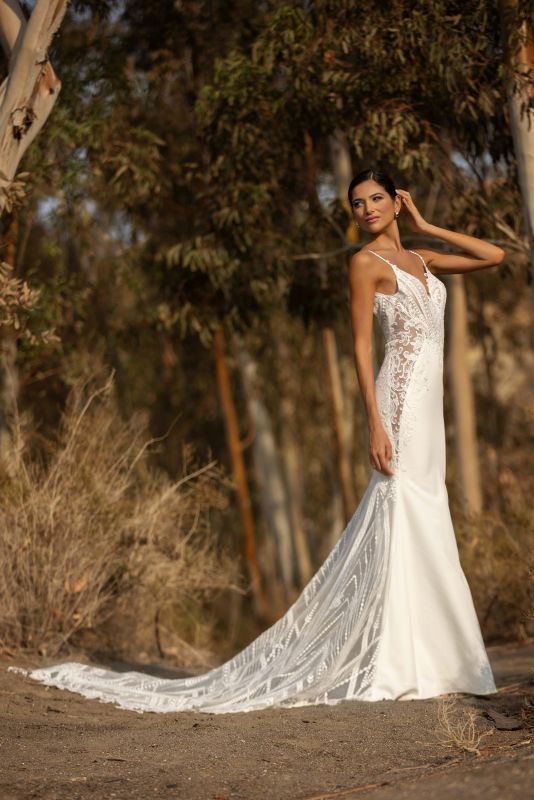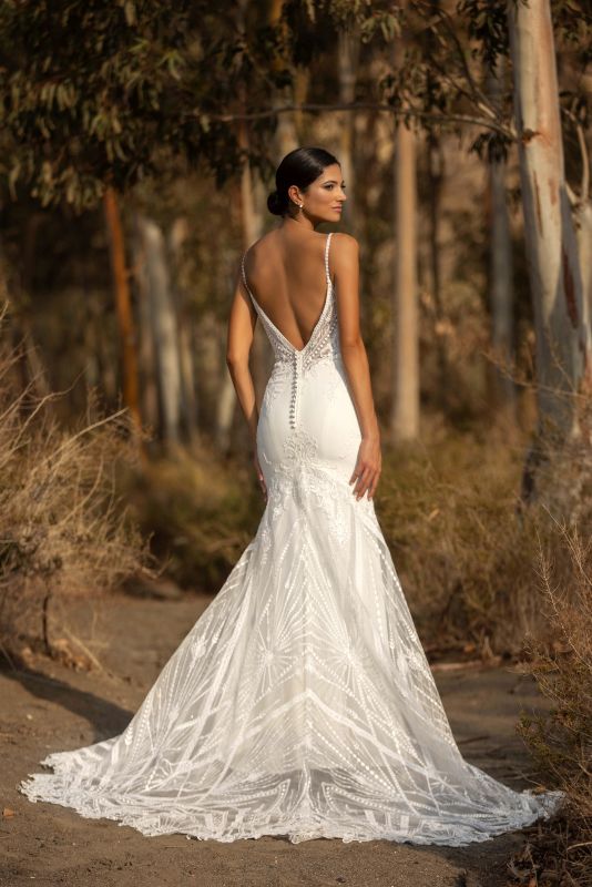 spaghetti strap, v neckline with scallop lace detail and sequins, sheer sides all the way down with same scallop lace detail as the bodice, deep v back, sheer semi cathedral train