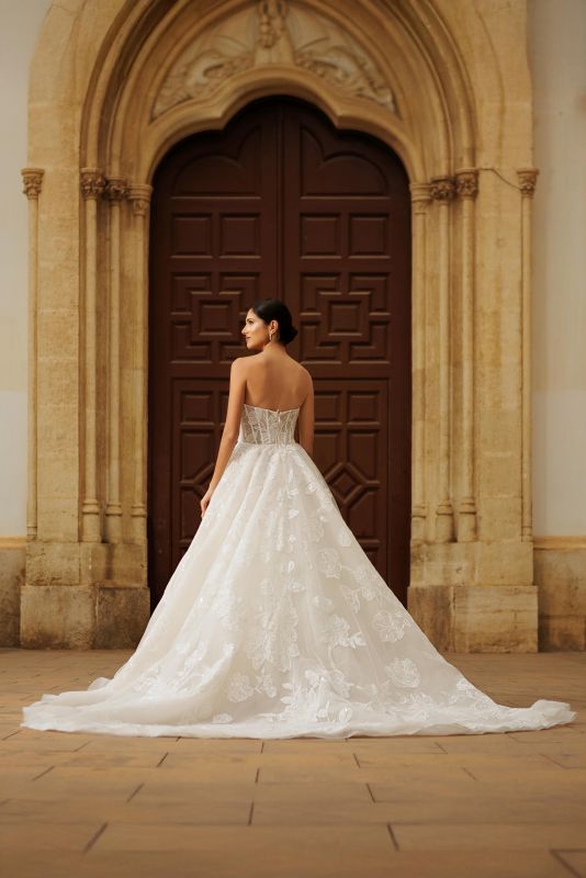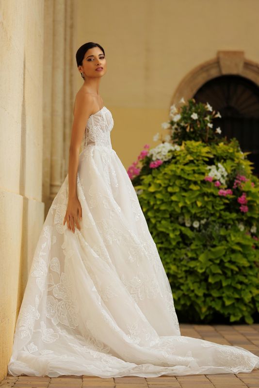 strapless, sweetheart neckline with plunge, sheer bodice with boning, straight across back, cathedral train