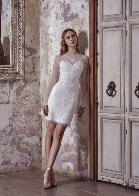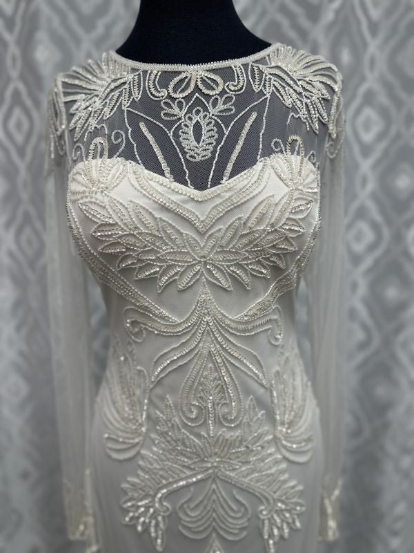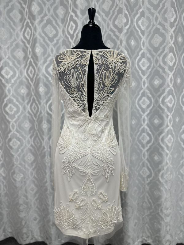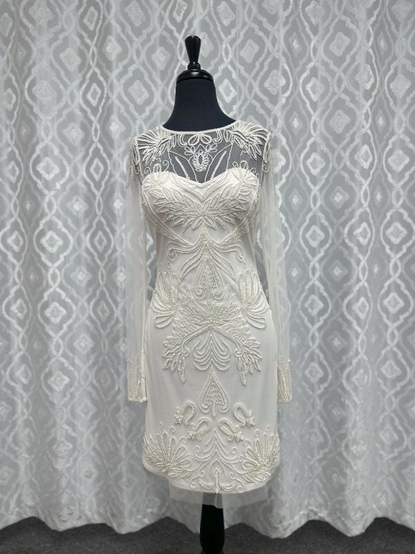 long sleeve sheath short dress with vintage, gatsby style beads and sequins. Keyhole back. This dress is perfect for engagement photos, rehearsal, bridal shower, or going away