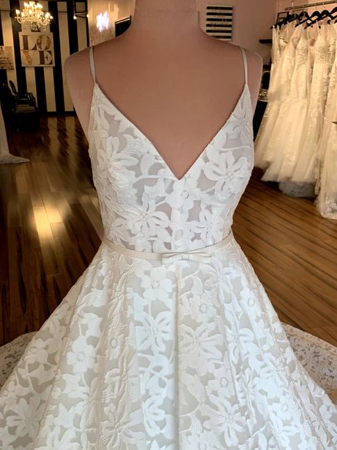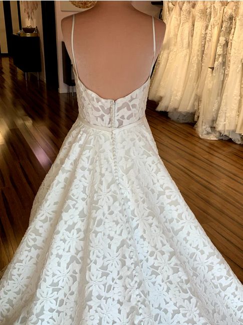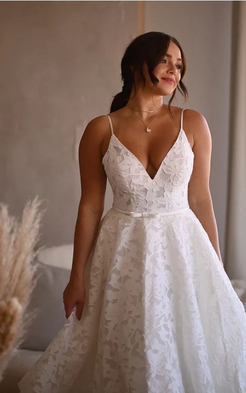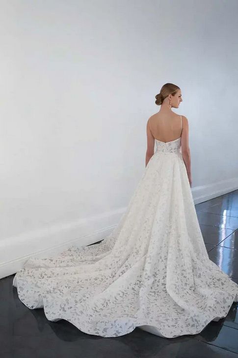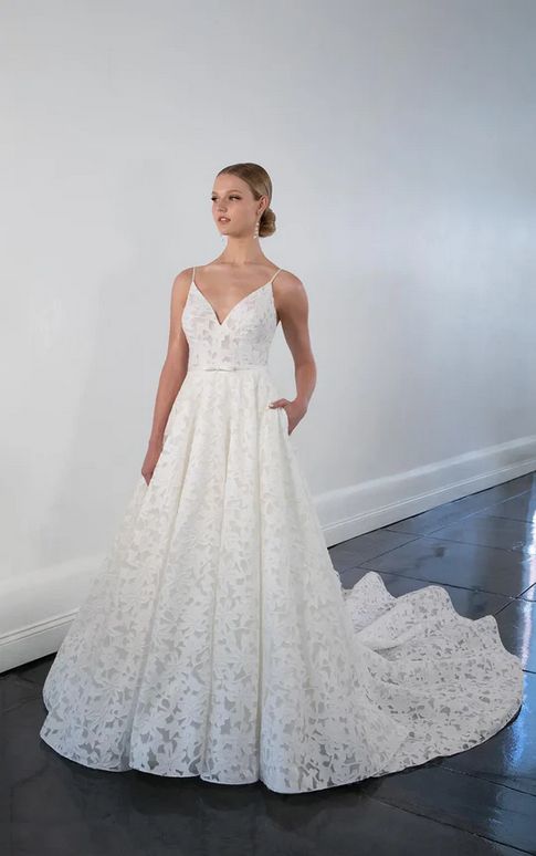Simple and elegant, Style 1467’s classic A-line silhouette is modernized by a textured floral organza lace throughout for that chic, timeless bridal look. Sleek spaghetti straps meet a deep V-neckline for a flirtatious touch. In the squared lightly dipped back, a row of fabric-covered buttons trail the gown from the back bodice to the edge of the train. At the tailored waist, as a voluptuous A-line skirt effortlessly flows into a cascading train, discreetly containing hand pockets for a simple and easy wedding look that adds a modern twist on tradition