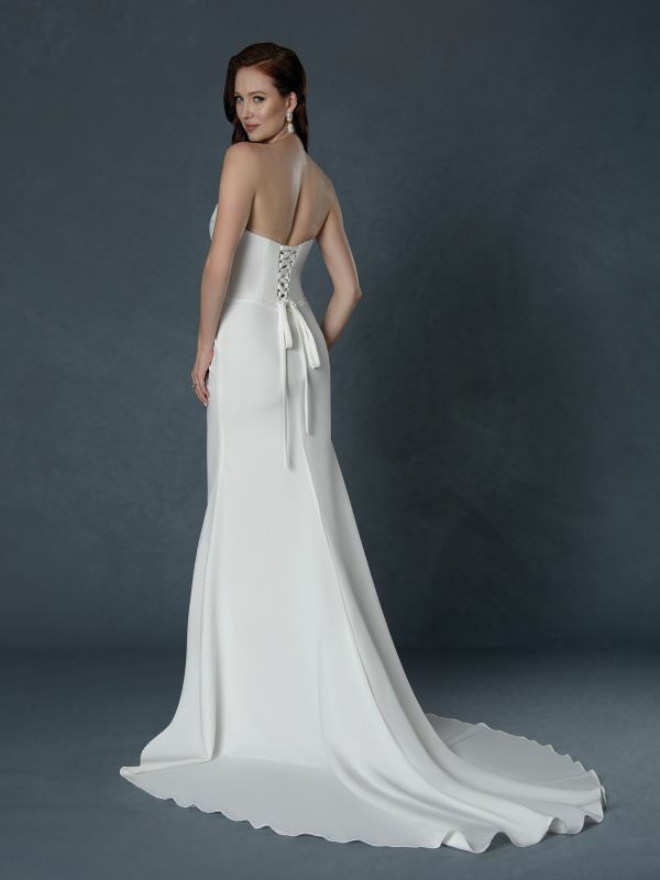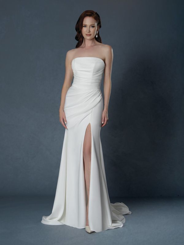 strapless, straight across neckline, ruched bodice with draping, small loop corset back, optional wrap included