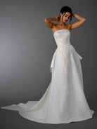 strapless, straight across neckline, embroidered lace with embellishment on the bodice, skirt and train. Optional detachable bow included for the back