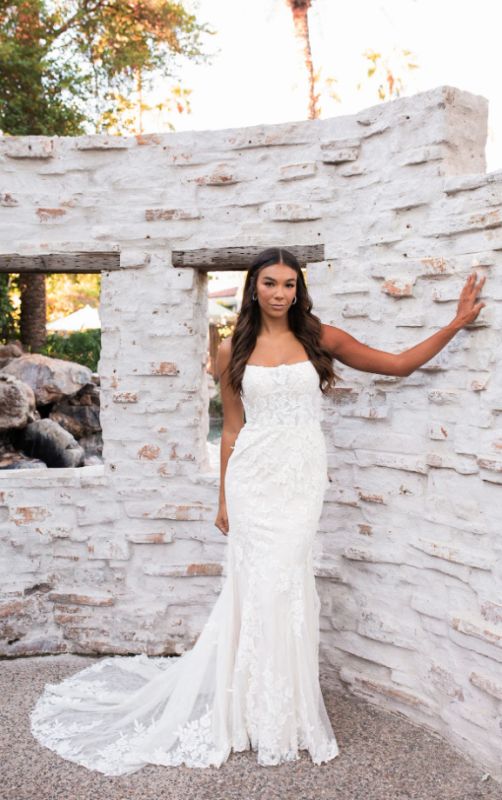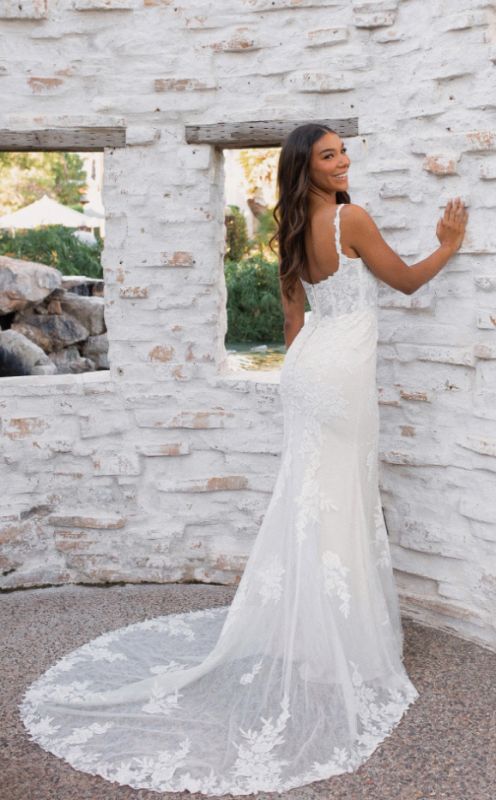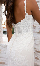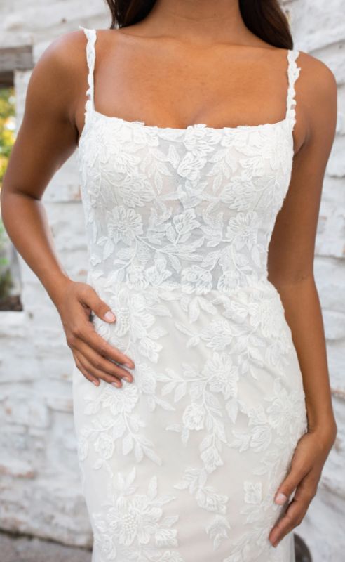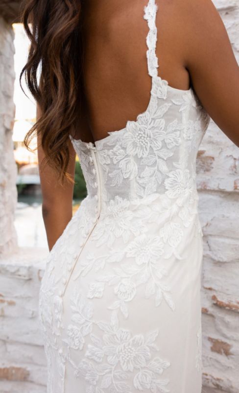 matte floral all over lace wedding dress begins with elegant lace spaghetti straps that meet a sophisticated square neckline. The fitted bodice is lined. In the back, a row of fabric-covered buttons add an element of nostalgic romance as the fit-and-flare skirt softly drapes into a dreamy sea of lace and tulle. For the final finishing touch, hand placed lace appliqués adorn this gorgeous wedding dress for a swoon-worthy lace-trimmed train.