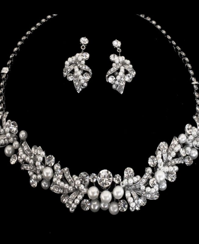 braided rhinestone swirls and pearl strings necklace and earring set with round rhinestone and pearl accents