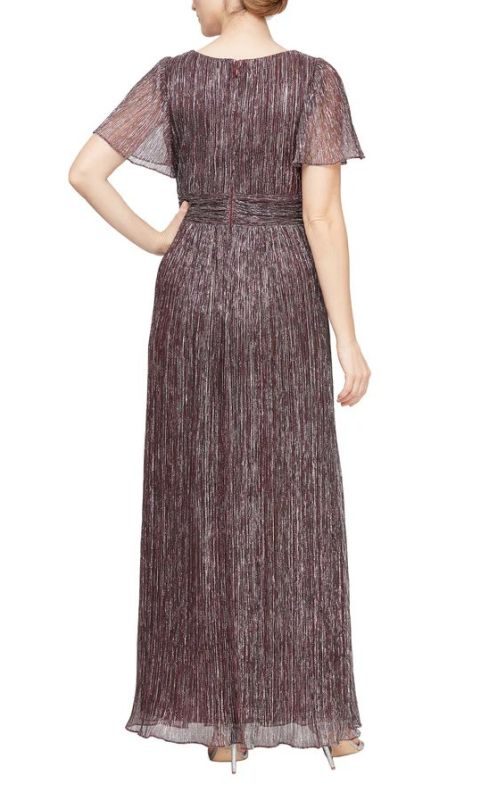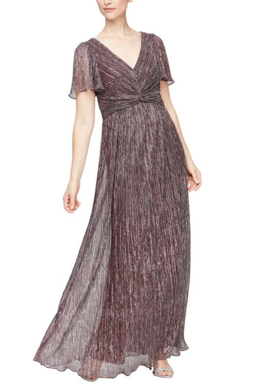 V-neckline and empire waist that flatters the figure. Short flutter sleeves, accented with twist front detailing, complete this timeless beauty. With a full length silhouette