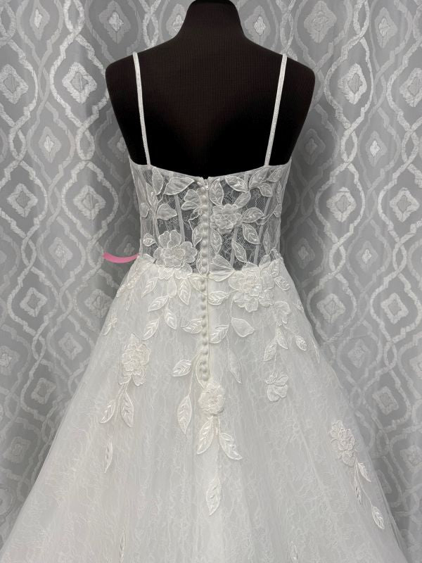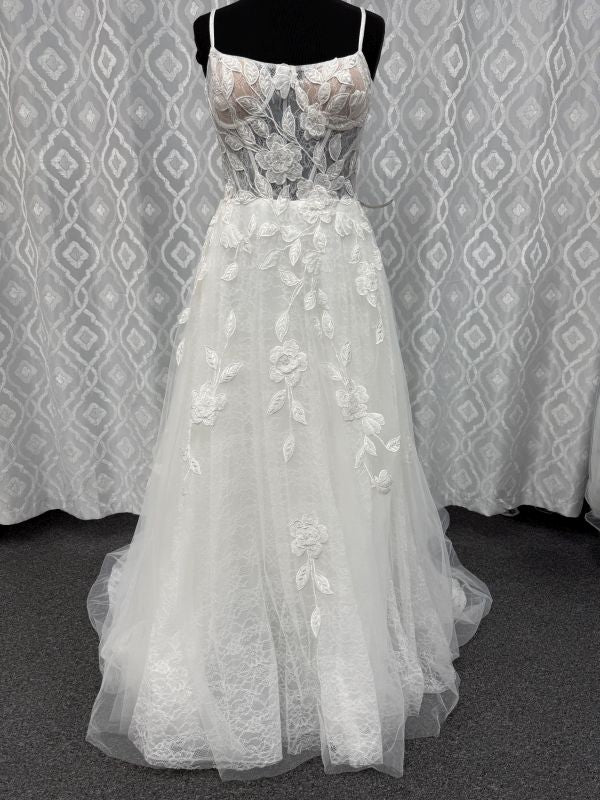 tank style, slightly scoop neck with spaghetti straps, sheer bodice with exposed boning, high back, large floral appliques on the bodice and throughout the multi layer a line skirt, semi cathedral train