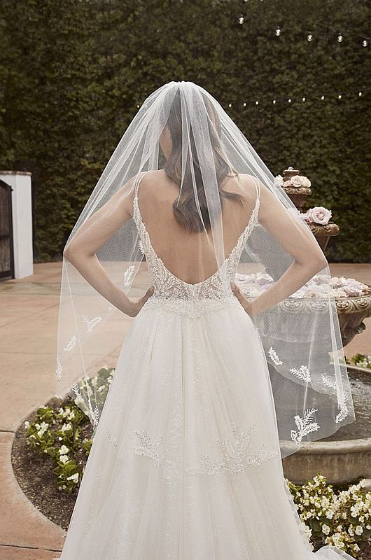 120" beautifully beaded veil with leaves and vines gathered on a metal comb matching style 2462 Carrie (available in various lengths) this is a cathedral length veil