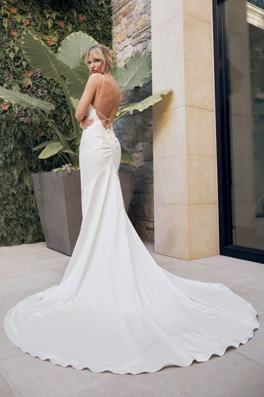 Sexy chic is the forever-theme with stunning LE101 Simone. This modern wedding dress is perfect for the bride looking for a clean, voluptuous look. Silky stretch georgette makes up the entirety of this enticing design, wrapping all around the figure huggi