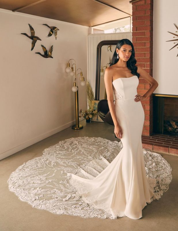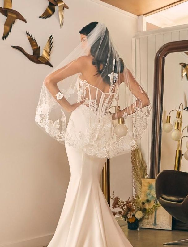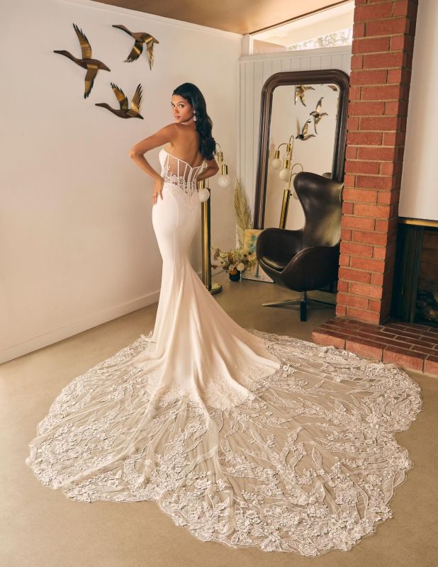 A modern bridal rendition of Old Hollywood glamour, Style BL405 June by Beloved unites exquisite simplicity with precise tailoring in a luxuriously fitted stretch lining and stretch chiffon. Strategically placed lace nips at the waist of this fit and flare silhouette, where every line is designed to flatter and enhance the bride's curves. In the back, a sheer bodice reveals exposed boning, culminating in a spectacular 113" train.