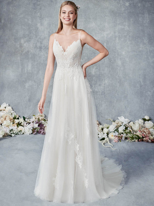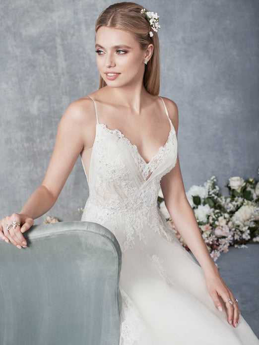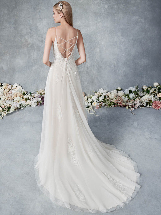 DISC spaghetti straps, v neck, pleated ruched bodice w/ lace applique, a line skirt w/ lace, criss cross open back