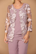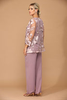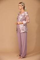 3-piece pebble georgette pant set with matching tank top and lace jacket. Pants have pockets and elastic waist, fully lined. Tank top is fully lined and has back zip for easy wear. Jacket has 3/4 sleeves and hook and eye closure at nape (available in sizes S-5XL) Available in champagne, navy, silver, dusty blue, mauve)