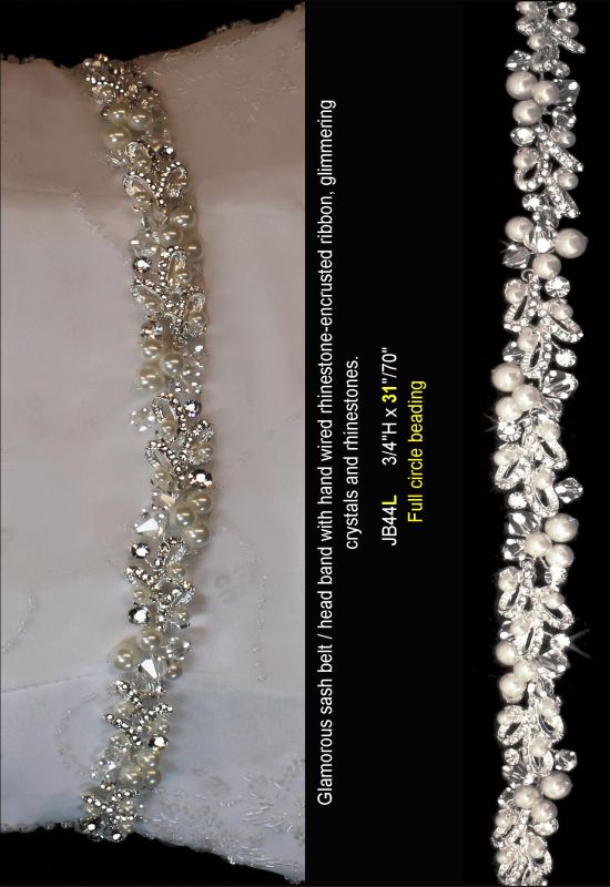 full circle 31" of beading belt/headband with wired vines and leaves design of crystals, rhinestones, and pearls on a satin ribbon