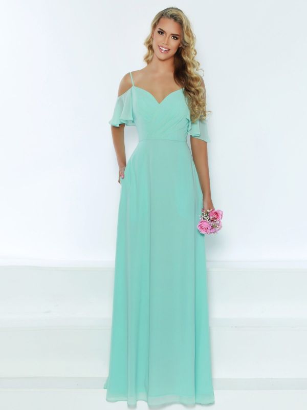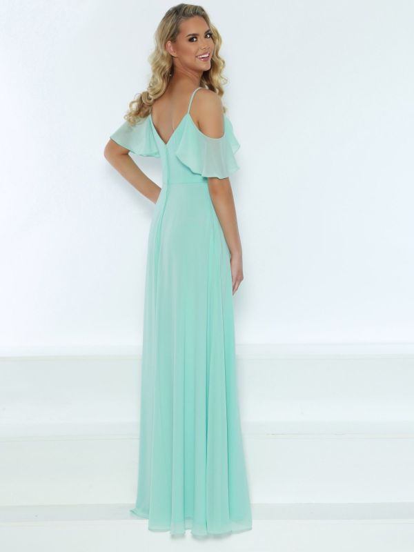 spaghetti strap sweetheart neckline with ruffle off the cold shoulder v-back has natural waist flat front floor length chiffon
