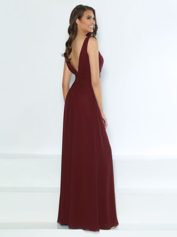 tank style v-neckline pleated bodice v-back with wide pleated natural waistline front split floor length chiffon