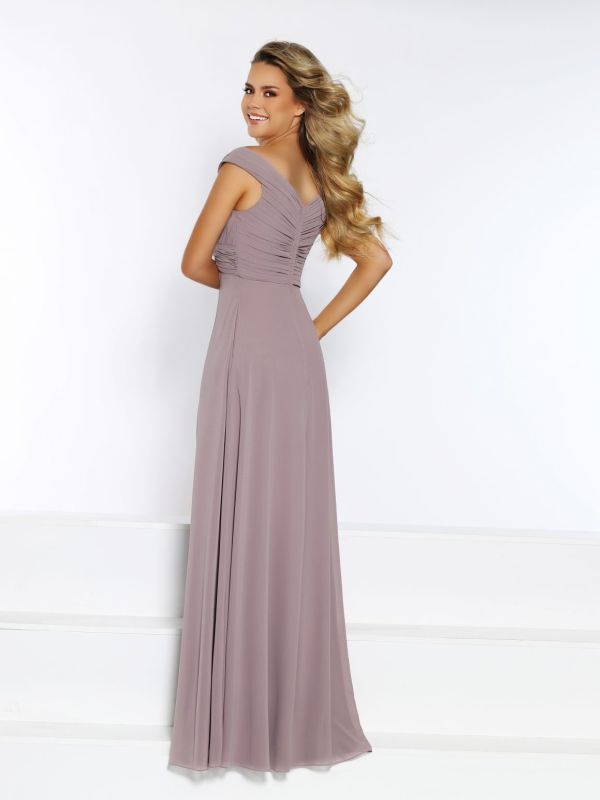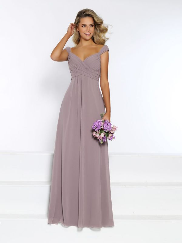 Slight cap sleeve, off the shoulder, pleated criss cross bodice and waist band, center front gathers, a line skirt with pockets.