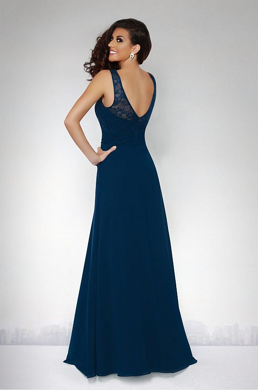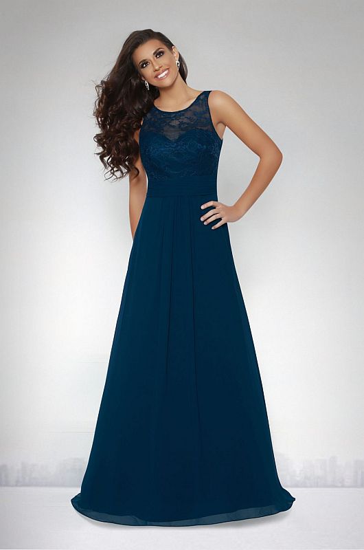 tank style lace bodice bateau neck with v-back and a-line chiffon skirt with pockets