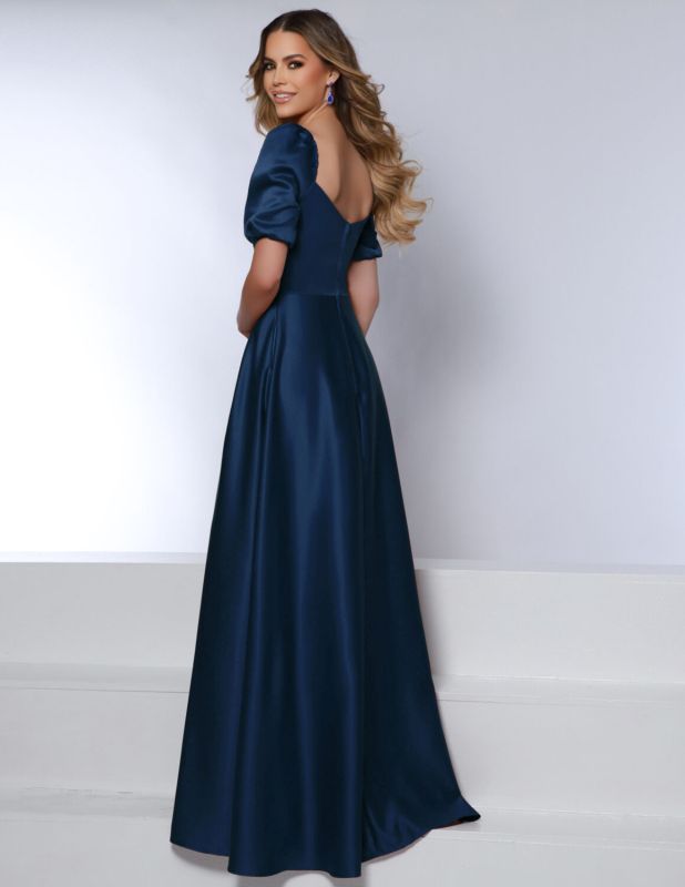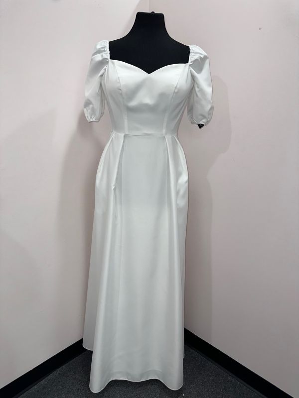 sweetheart neckline, elbow length sleeves with elastic that can be worn multiple ways, pleats on the front create a subtle princess look - this gown is ivory