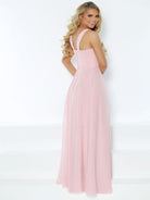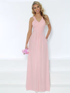 wide strap u-neckline inverted pleated bodice wide straps in back with pockets and floor length chiffon