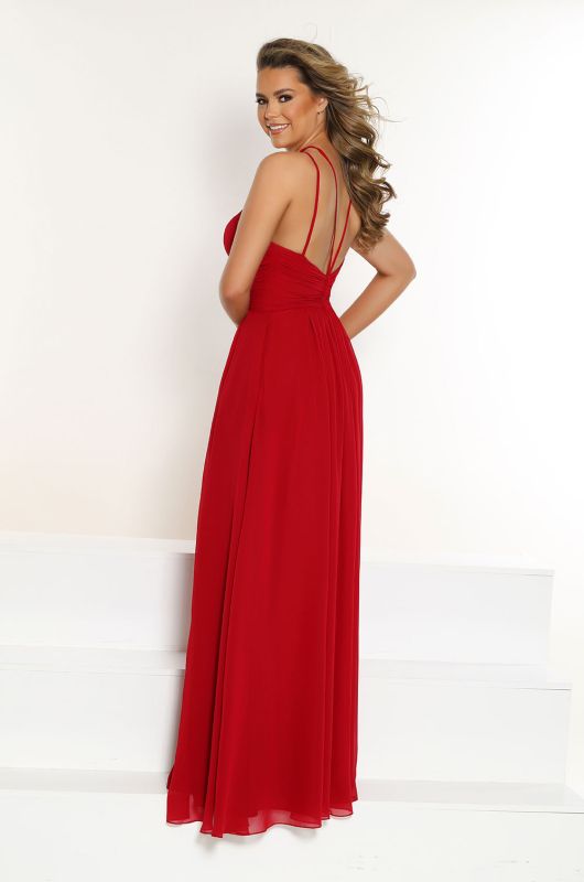 Twisted halter neckine w/ keyhole, ruched criss cross bodice, gathered waistline, slightly low strappy back, a line skirt with pockets and slit