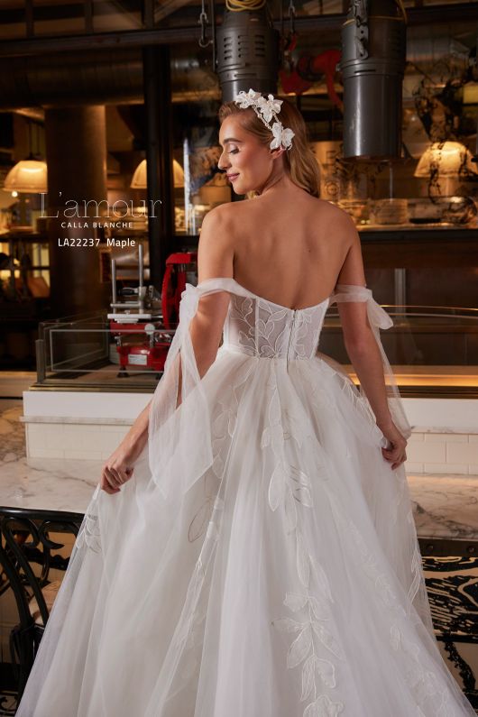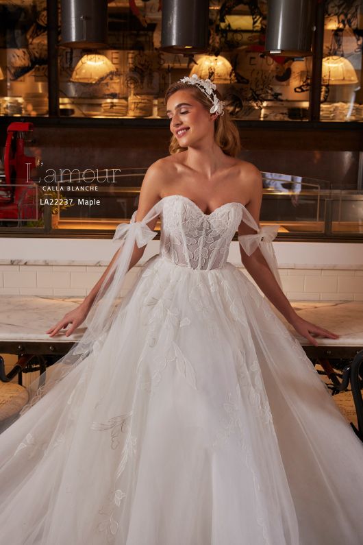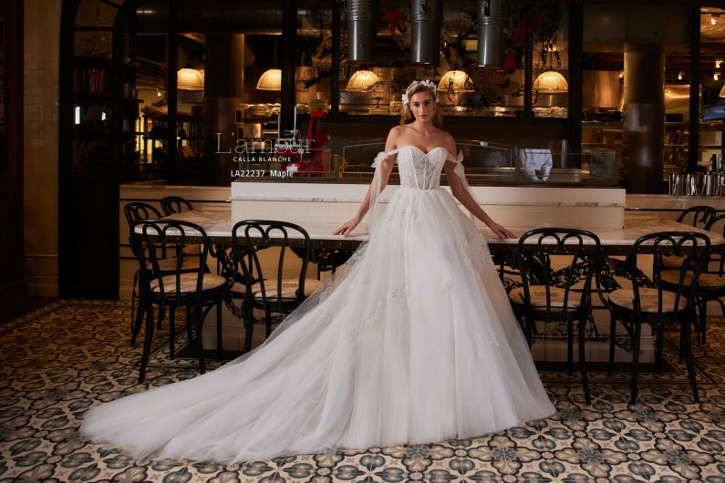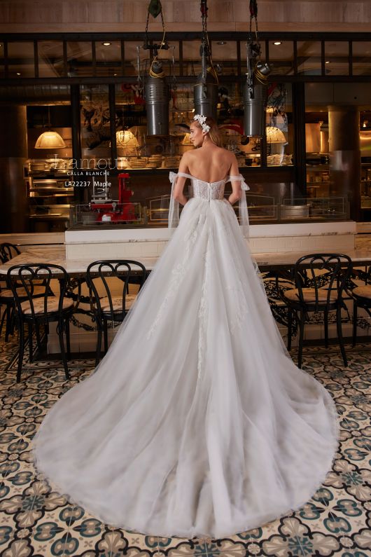 The beauty of this classic ball gown will not only give you the things you want in a wedding dress, but it will give you the things you need to feel like the most beautiful version of yourself. Designed with off the shoulder tulle sleeves, a romantic sweetheart neckline, a train that seemingly lasts for days, and pockets for all of your favourite things, this gown is sure to cause that say yes to the dress moment you’ve been waiting for!