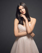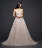 Blush shimmer tulle silk organza ball gown, sweetheart neckline, draped bodice with natural waist, box pleated full aline skirt with side pockets, semi-cathedral train, added swag sleeve/strap and added bustle.
