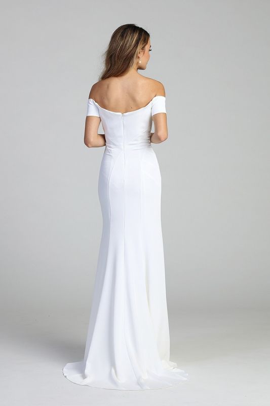 off the shoulder, modified sweetheart neckline, body con like informal bridal gown with sweep train