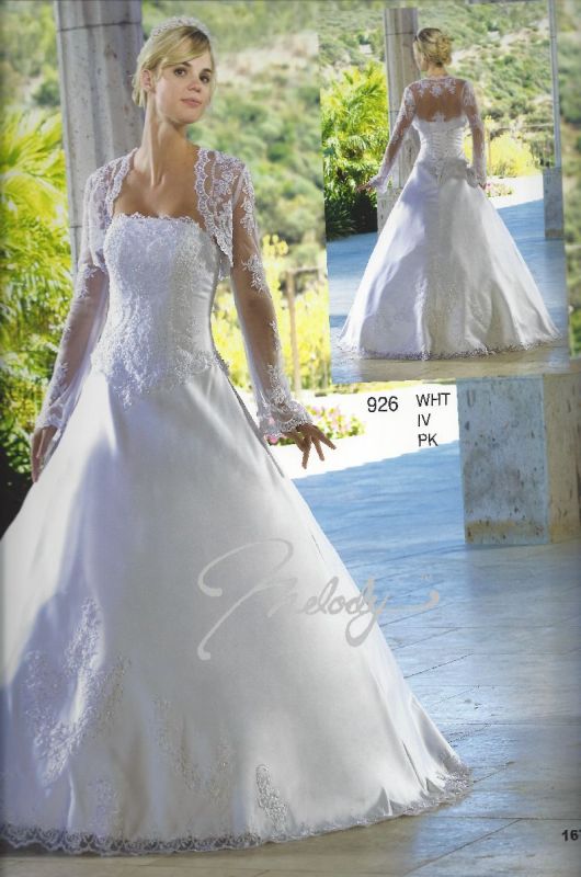 strapless straight across neckline with pearl lace detail applique on skirt and hem lace all around full corset back and comes with long sleeve tulle bolero jacket with applique