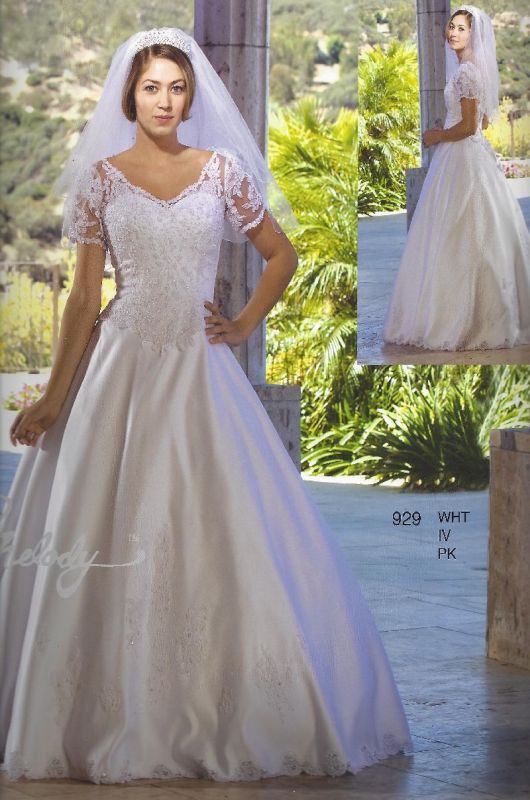 cap sleeve V neckline front and back with lace pearl detail basque waist full ball gown skirt with applique and scallop lace hemline. Zipper back. PERFECT for a Debutante or Cotillion