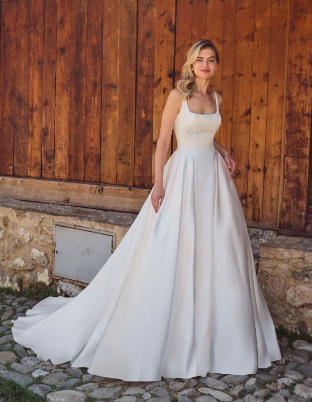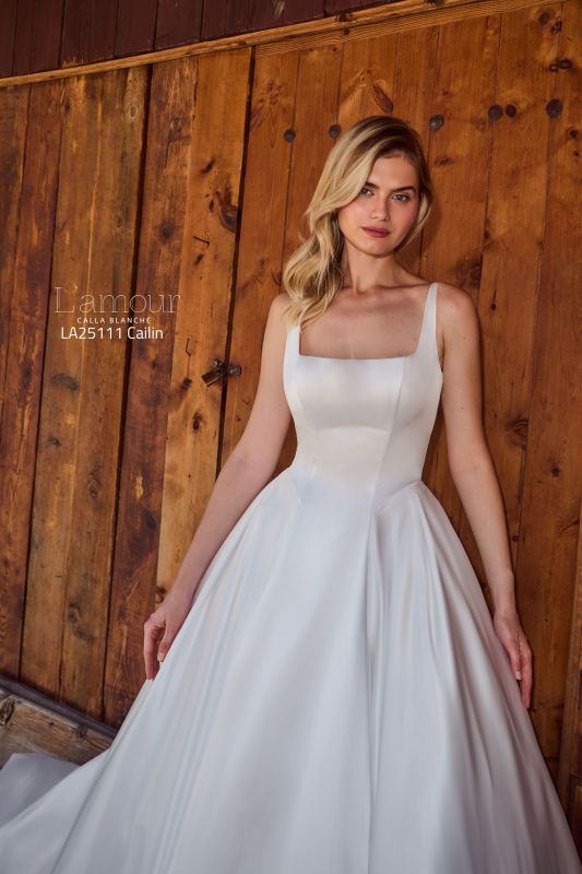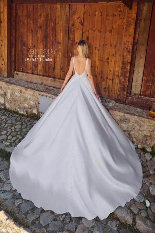 Effortlessly chic and timeless, Cailin is designed for brides who embrace simplicity with sophistication. This classic A-line wedding dress, crafted from luxurious satin, flows gracefully from her supportive tank straps to a voluminous skirt that glides as you walk down the aisle. Cailin’s sleek, minimalist style is accented with practical and fashionable details - hidden pockets for convenience and a daring backless design that adds just the right amount of sensuality. Whether you’re walking down the aisle in a grand cathedral or saying “I do” in a lush garden, this simple wedding gown exudes grace and confidence, making it the ultimate choice for a classic bridal look.