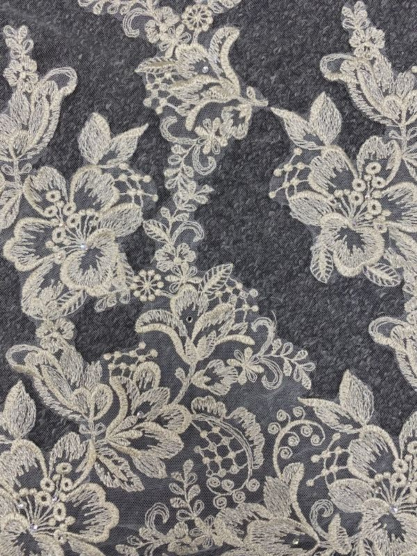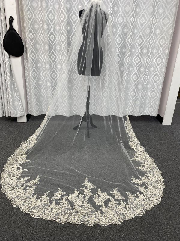 110" cathedral length veil with light champagne metallic thread throughout the lace appliques gathered on a metal comb