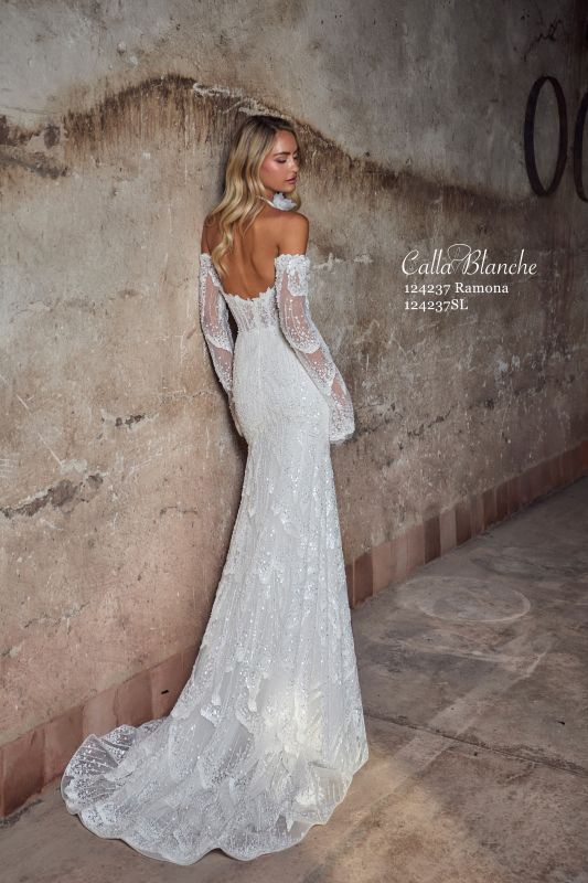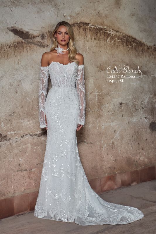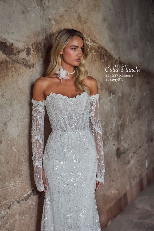 Turn heads and steal the spotlight with Ramona, a dazzling sparkly wedding dress with detachable sleeves (sold separately) designed for the modern bride who loves to shine. This gown features a breathtaking array of shimmering sequins and intricate beading, creating a stunning silhouette that glimmers with every movement. For an added dose of drama and elegance, pair Ramona with a flowing bridal cape (sold separately), transforming brides into a vision of grace and grandeur.