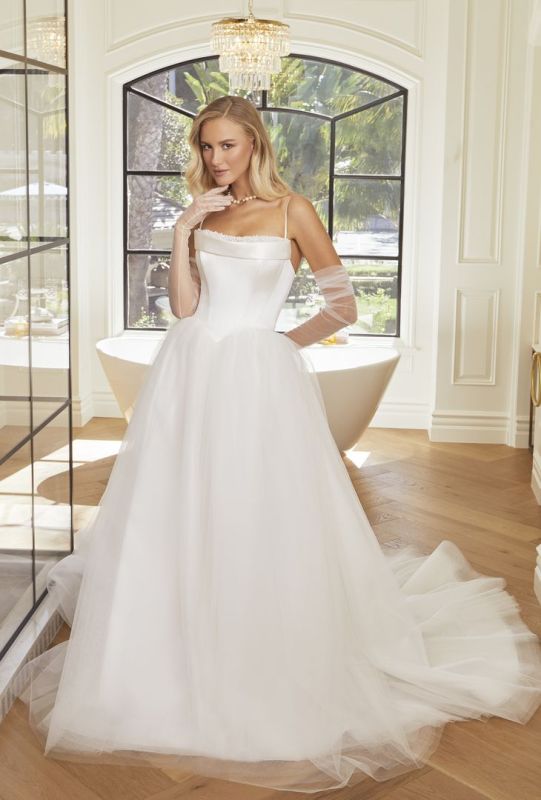 brides, petite to curvy. The satin bodice and eye-catching basque