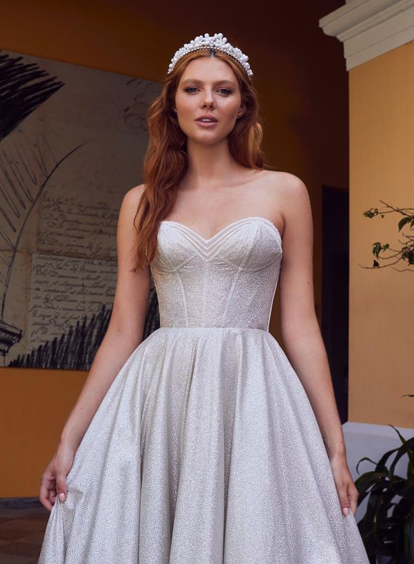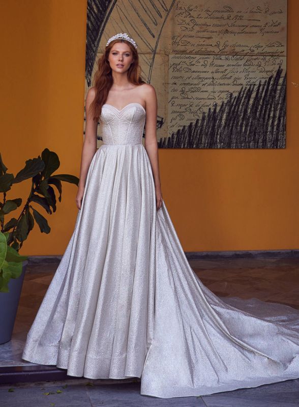 Shimmer as brightly as the diamonds on your ring finger with this strapless a-line wedding gown. Designed with shimmering taffeta, a romantic sweetheart neckline with beaded details, and pockets for all of your most precious items, this style is perfect for brides looking for something different without straying too far from tradition.