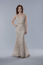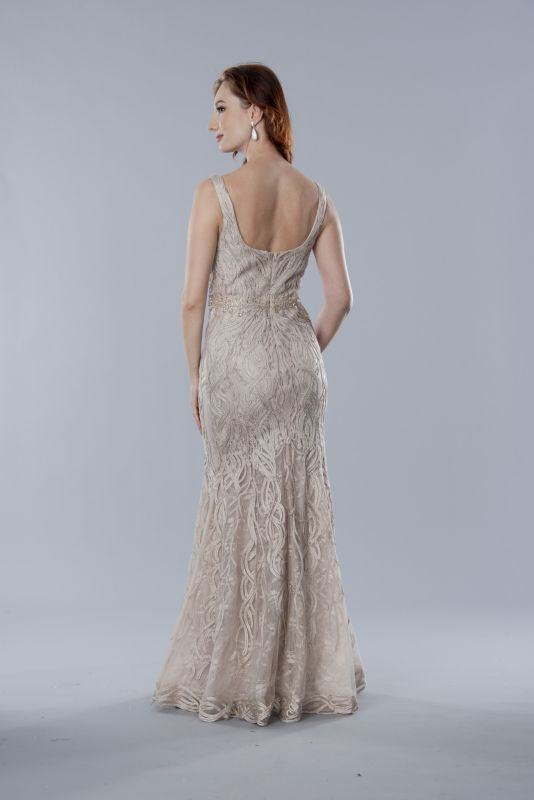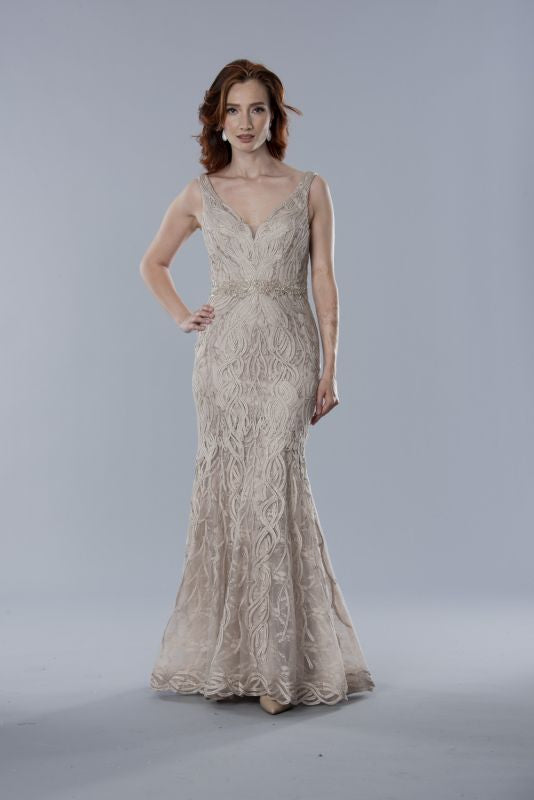 tank style, v neck, all over lace gown with attached beaded belt, u shaped back (available in Mocha or Charcoal sizes 6-20)