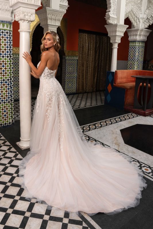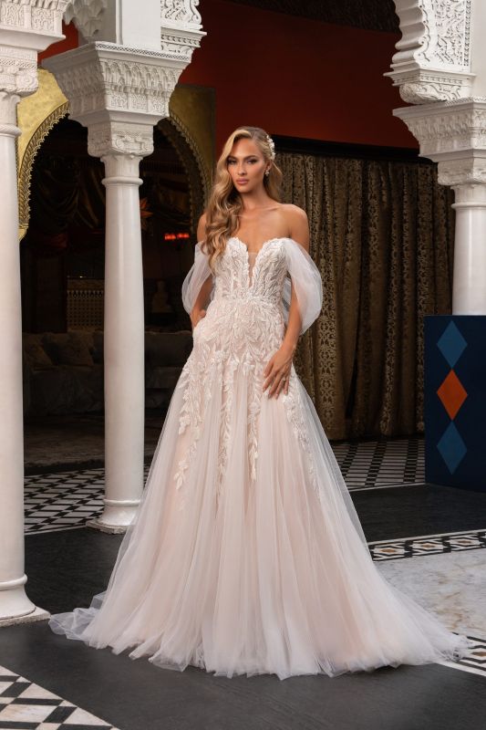 sweetheart neckline with plunge, all over leafy pattern beaded lace that drips on to the a line skirt with godet pleating, full cathedral tulle train. Comes with detachable puffy tulle off the shoulder sleeves
