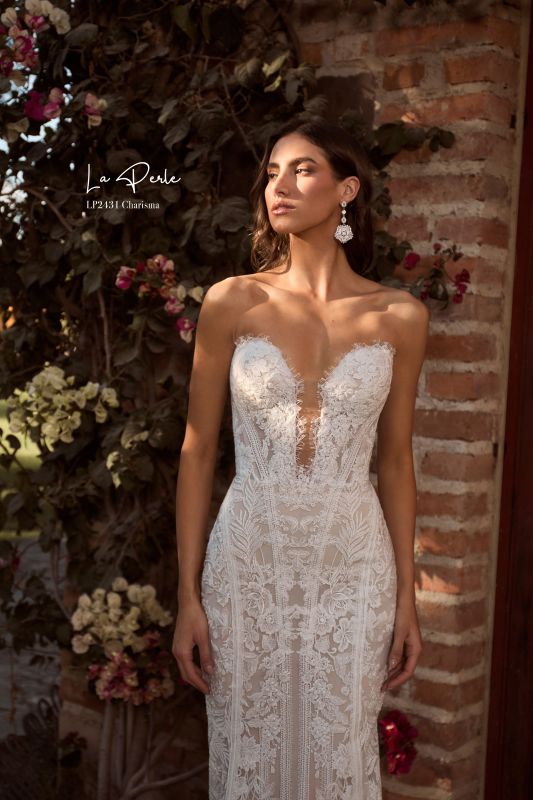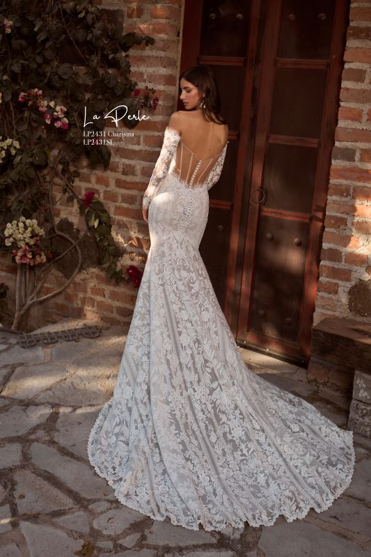 Ideal for brides who desire a blend of classic beauty and contemporary style, Charisma is your dream dress come true. This breathtaking mermaid wedding dress boasts a timeless off-the-shoulder design that seamlessly transitions to a strapless neckline, offering versatile looks for the bride throughout the day. With intricate boho lace from top to bottom, long sheer sleeves (sold separately) that add a touch of vintage charm, and a form-fitting bodice that accentuates your natural curves, Charisma helps you to exude, well…charisma!. Her illusion back is a true showstopper. Not only is it adorned with delicate lace patterns and a row of elegant buttons that add a touch of old-world charm, this design feature provides structure while still giving the charming effect of a backless gown. Whether you opt for the elegant sleeves or the classic strapless look, Charisma promises to make you the center of attention.