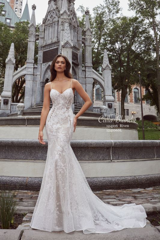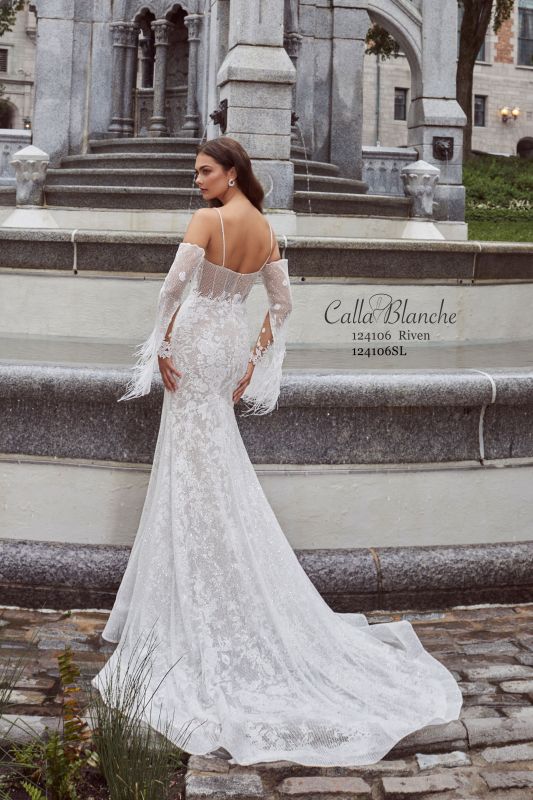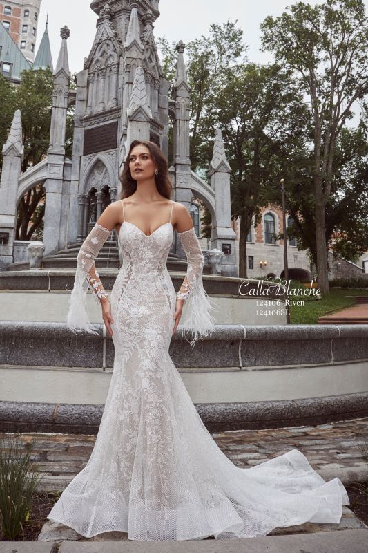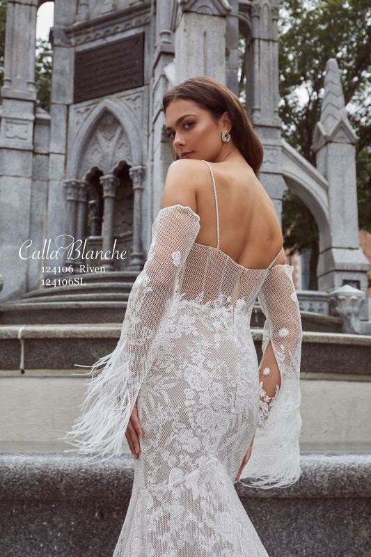 Feeling a mix of whimsical and flirty? Embrace the charm that is our Riven wedding gown with her lace and sparkly netting. This mermaid silhouette features sultry side illusions that extends down from the waistline into the front of the gown, beaded spaghetti straps, and a romantic sweetheart neckline. Add a touch of drama with her detachable long bell sleeves adorned with feather details for a truly unique and striking bridal look.Detachable sleeves sold separately.