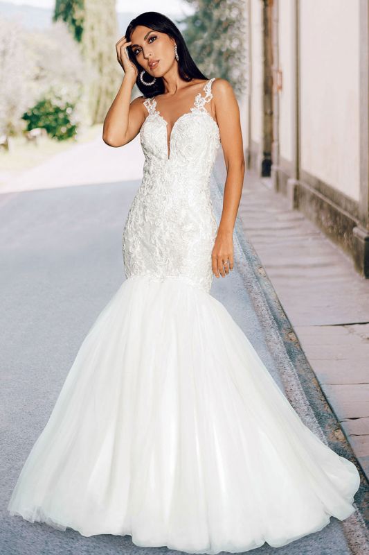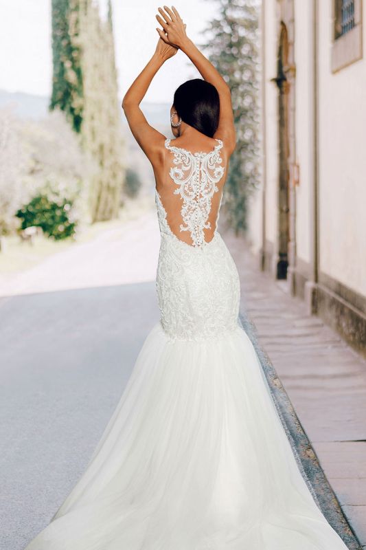tank style lace straps. all over beaded lace bodice with sparkle tulle underneath, full back with lace, full tulle mermaid skirt
