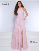 high neck halter with ruched bodice, full back with diamond cutout, front slit