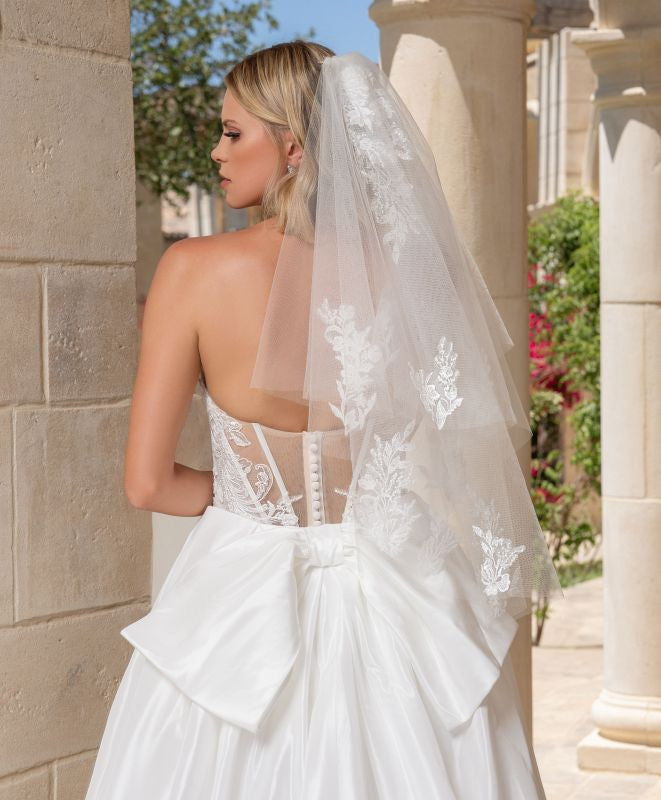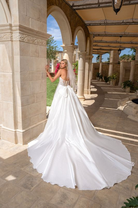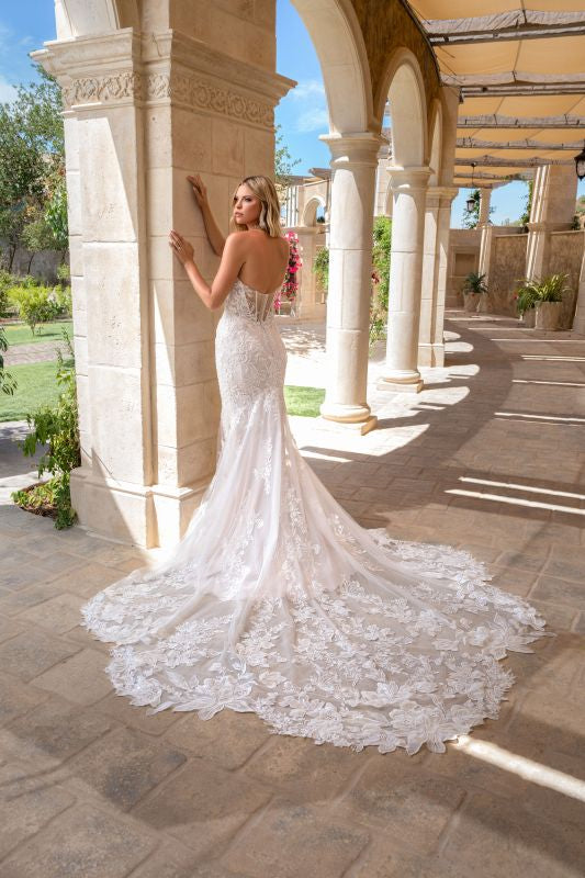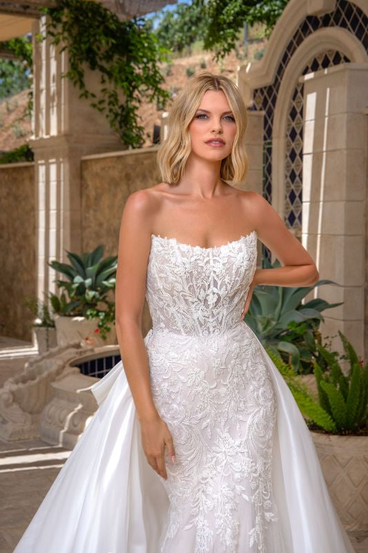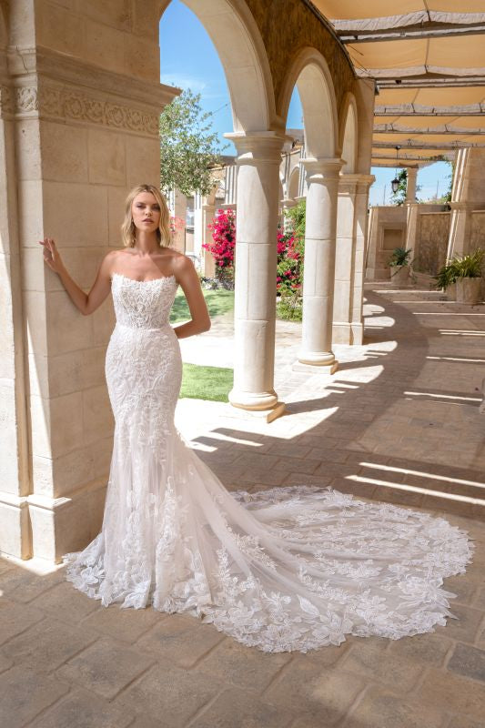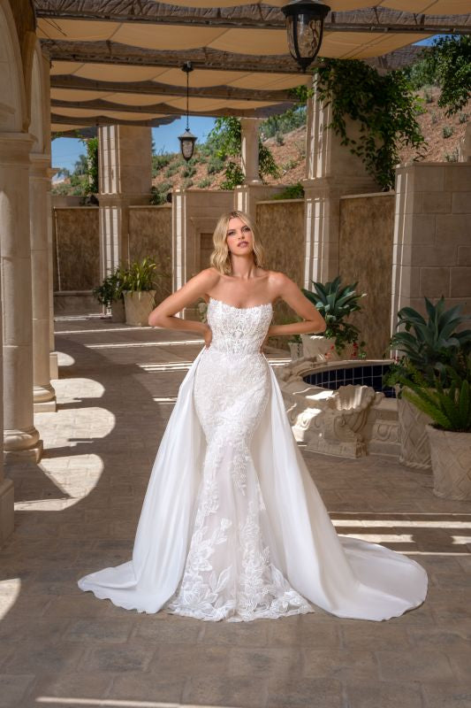 strapless cat eye neckline, all over beaded lace, sheer back, fitted gown with a signature Kitty Chen cathedral train. Gown and train are both available to be purchased separately. Also available in black