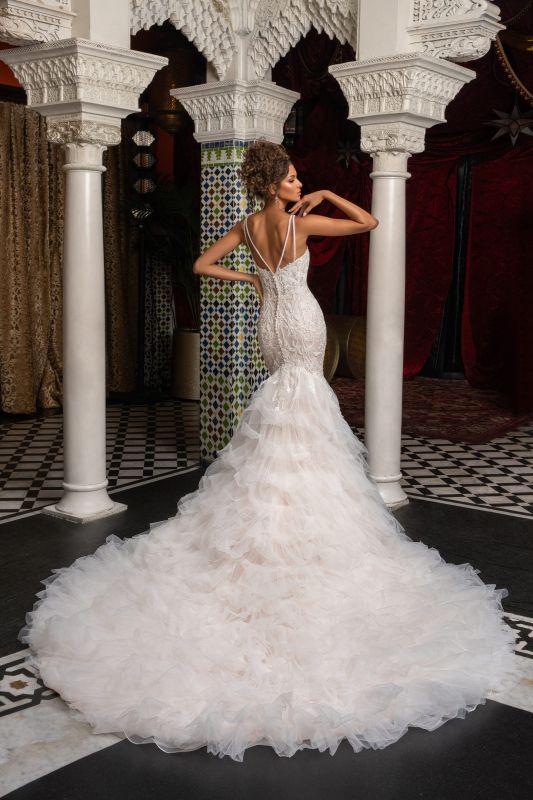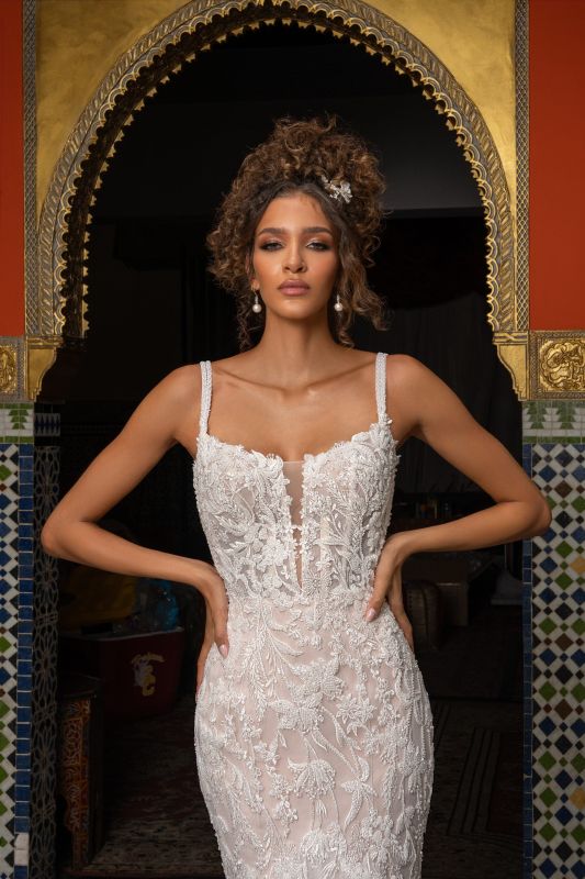 thin tank style straps, square plunging neckline with illusion, all over beaded bodice on a flouncy cut tulle skirt with cathedral train, semi high back with beaded double straps