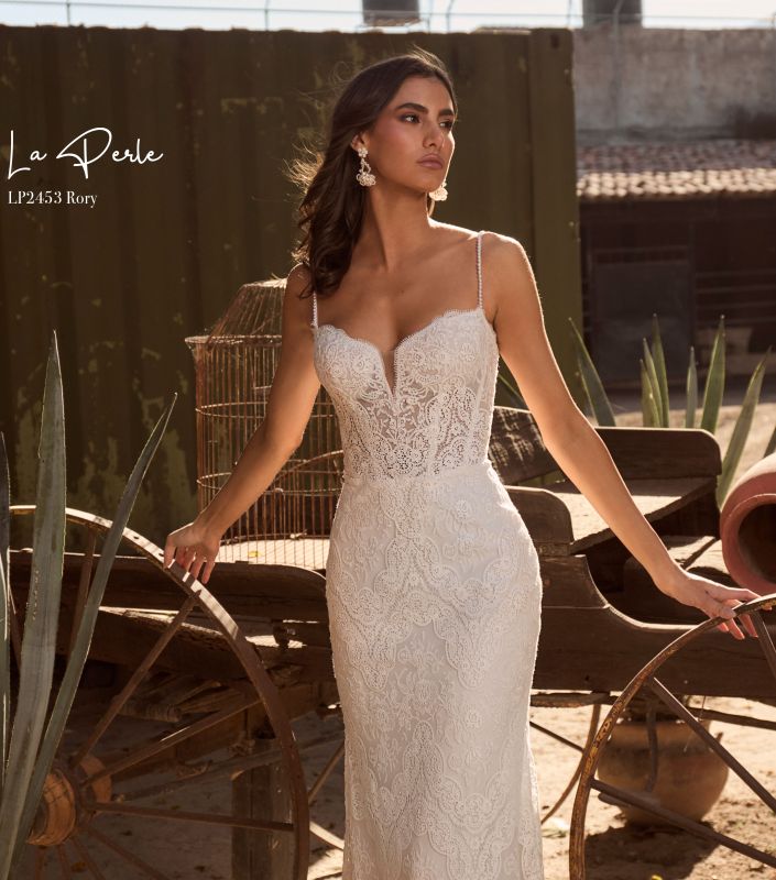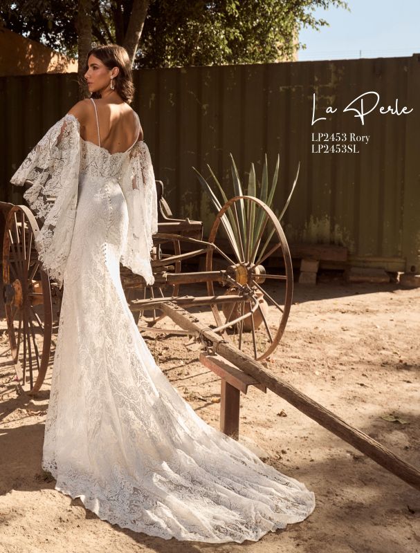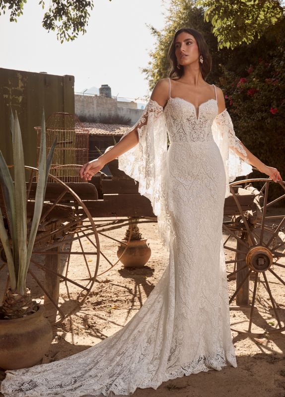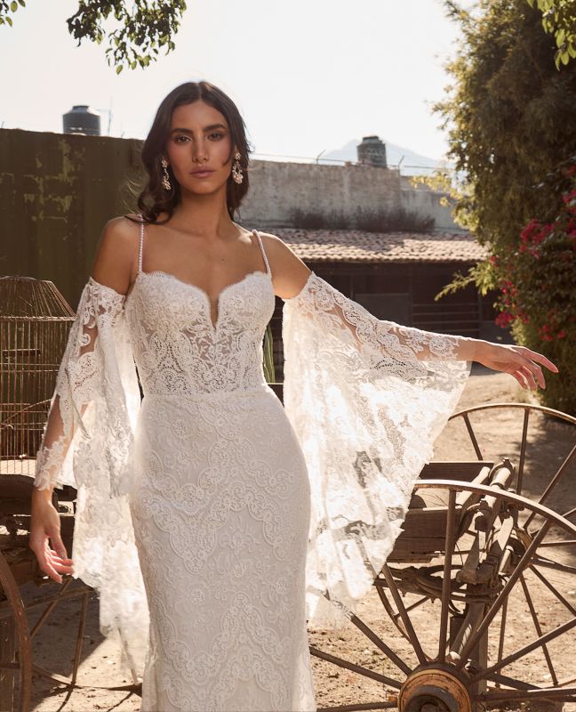 Perfect for a beachside ceremony or a mountaintop vow exchange, Rory is a sheath wedding gown designed for the free-spirited bride who loves to blend tradition with a touch of whimsy. Her bell sleeves not only flutter like butterfly wings, they are detachable (sold separately), allowing you to transform your style from classic elegance to boho chic in a matter of seconds. Rory’s delicate spaghetti straps and sweetheart neckline frame your collarbone beautifully, while her low back adds a hint of allure. Make your wedding day unforgettable with Rory, a gown as adventurous and unique as your love story.