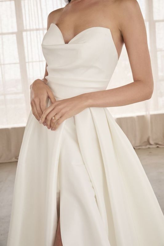 Style LE156 Lorraine is a timeless A-line wedding dress crafted from stretch Mikado and soft lining. Her strapless, sweetheart neckline frames the collarbones, décolletage, and face beautifully. One of her more notable features is her 14-point boning built into the bodice to achieve a flawless fit and supportive structure for all brides, petite to curvy. This classic silhouette is unique with a thigh-high slit in the skirt drawing your attention to a stunning 73-inch train. LE156 Lorraine is sophisticated and clean, designed for the modern bride.