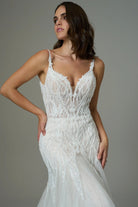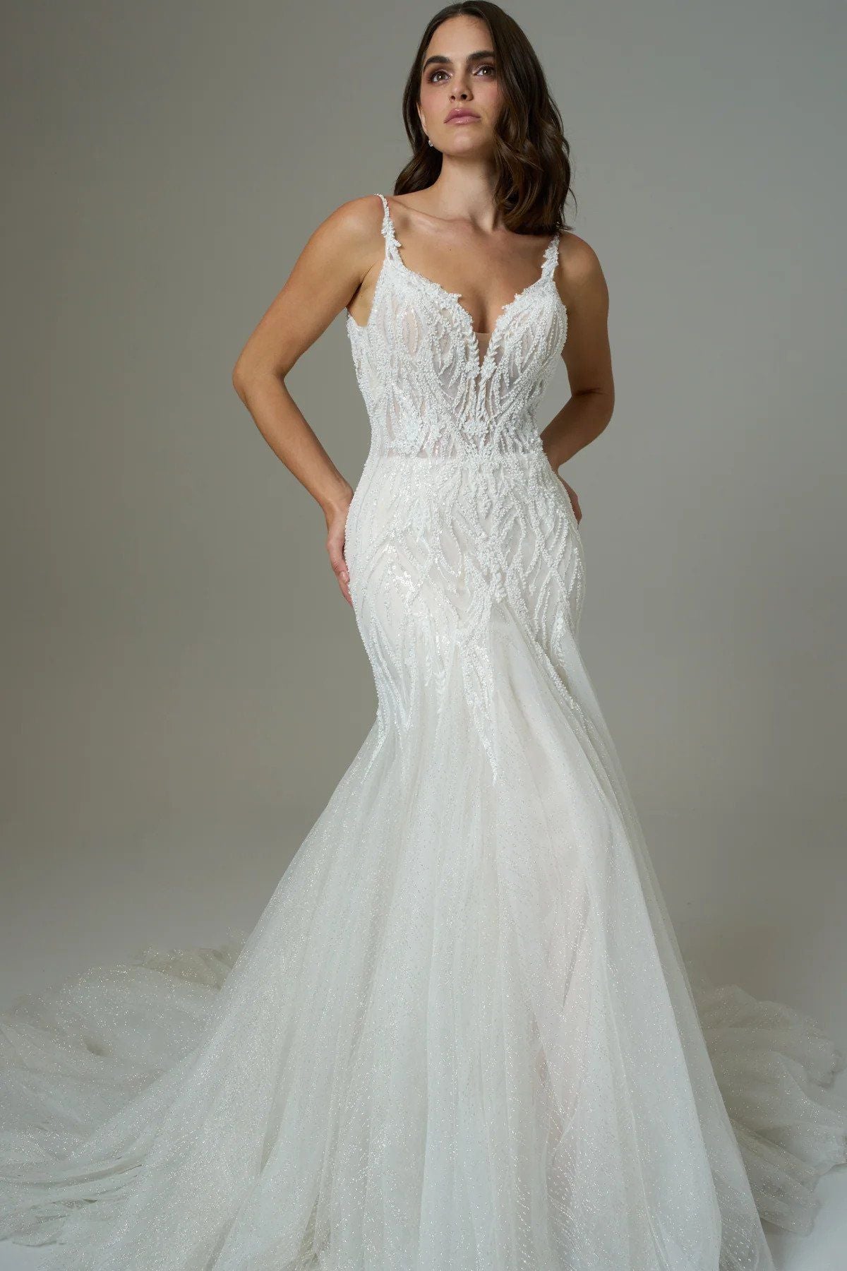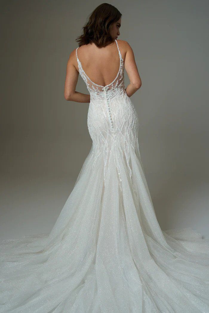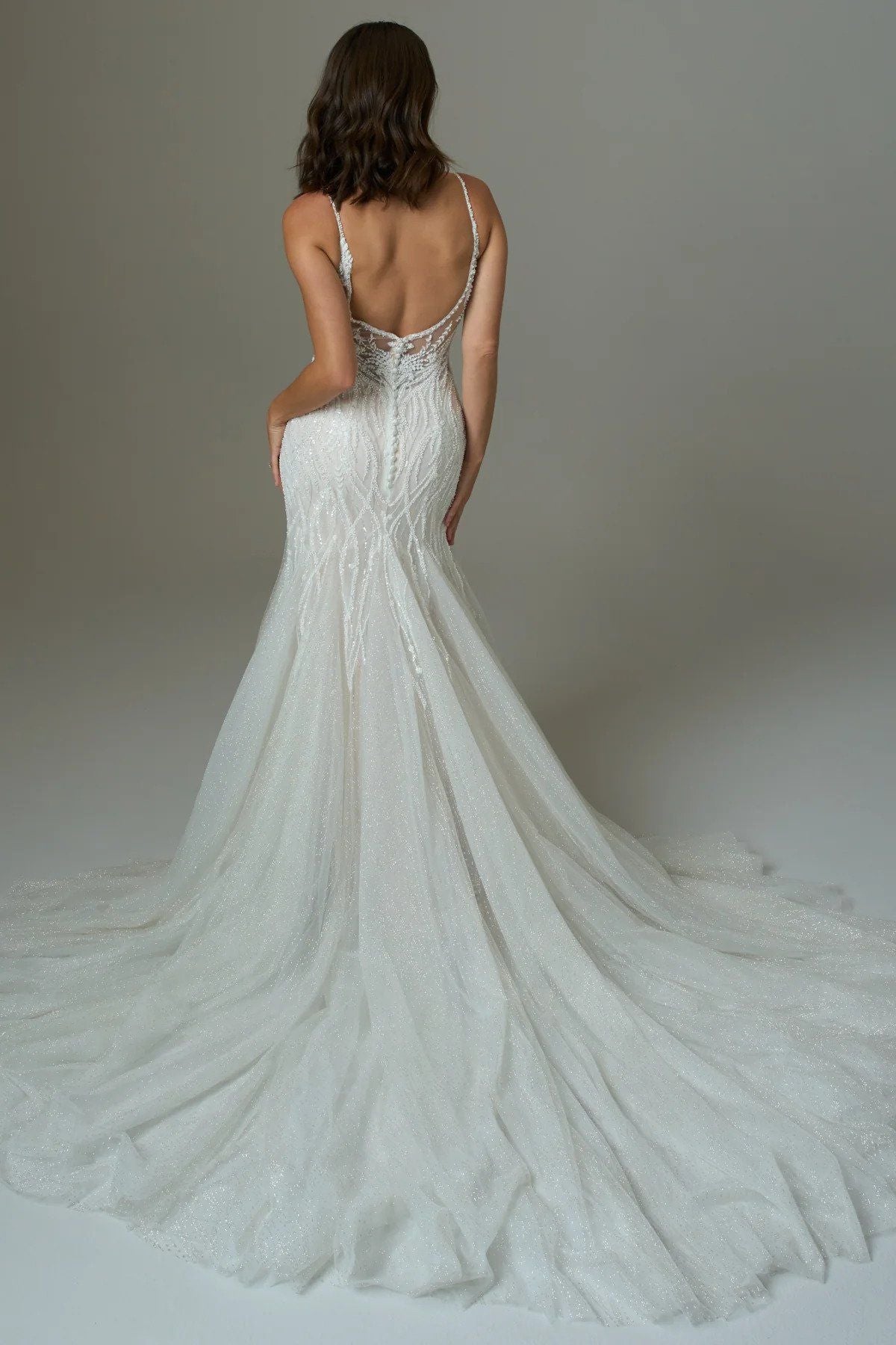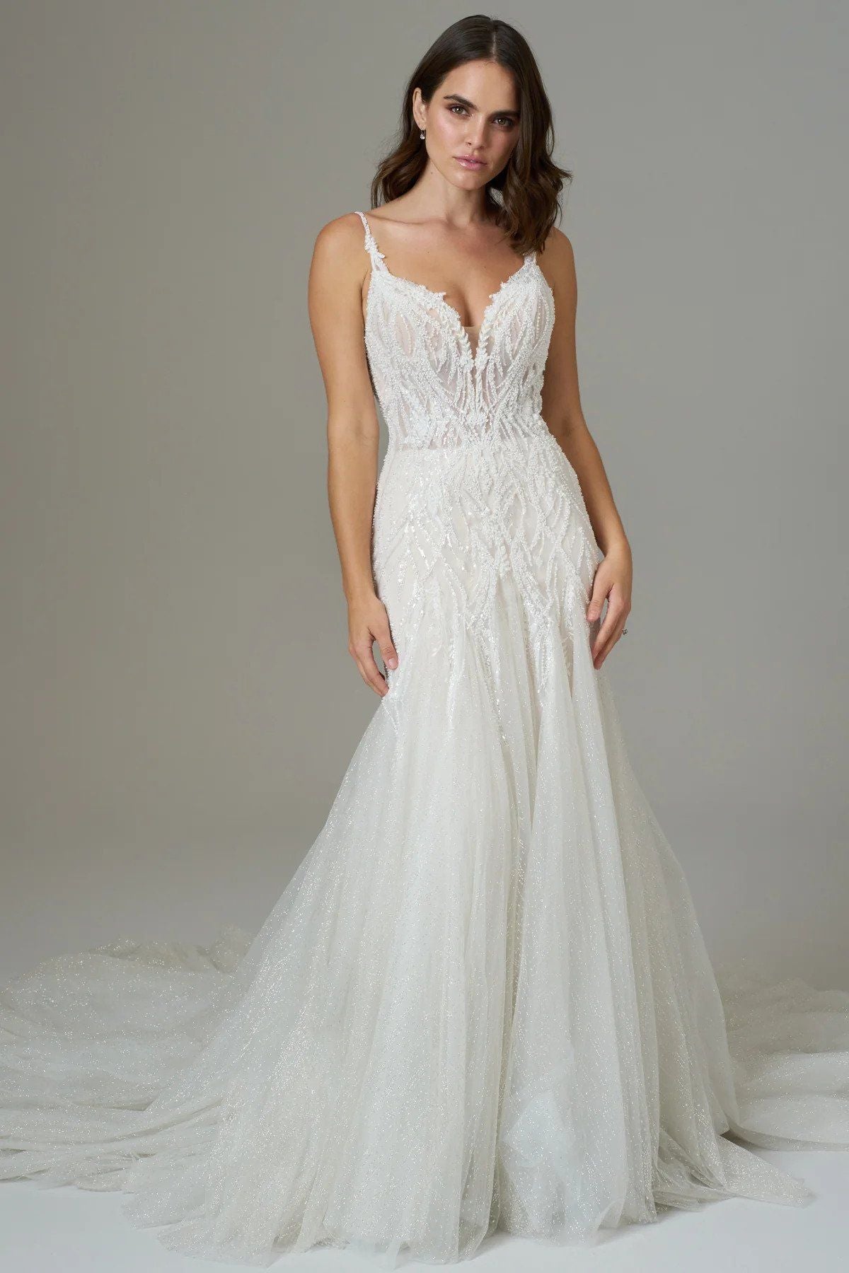 Collect all the oohs and ahhs when walking down the aisle in this Kenneth Winston style 1998. Tank style, v neck with all over beaded Himalayan lace from the bodice down onto the fitted sparkle tulle skirt. The semi low v back is accentuated with beading and illusion. The sparkle tulle cathedral train will shine as you make your way down the aisle!