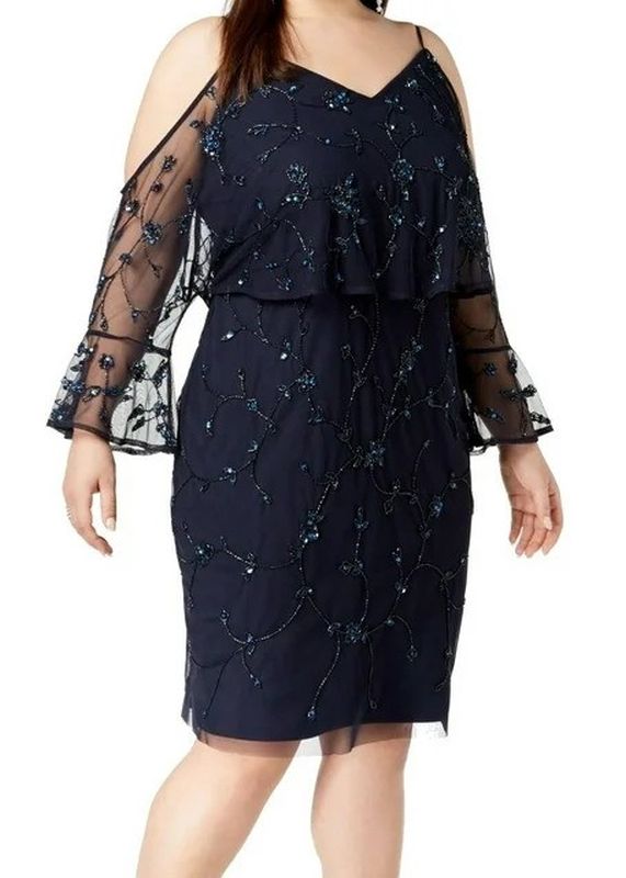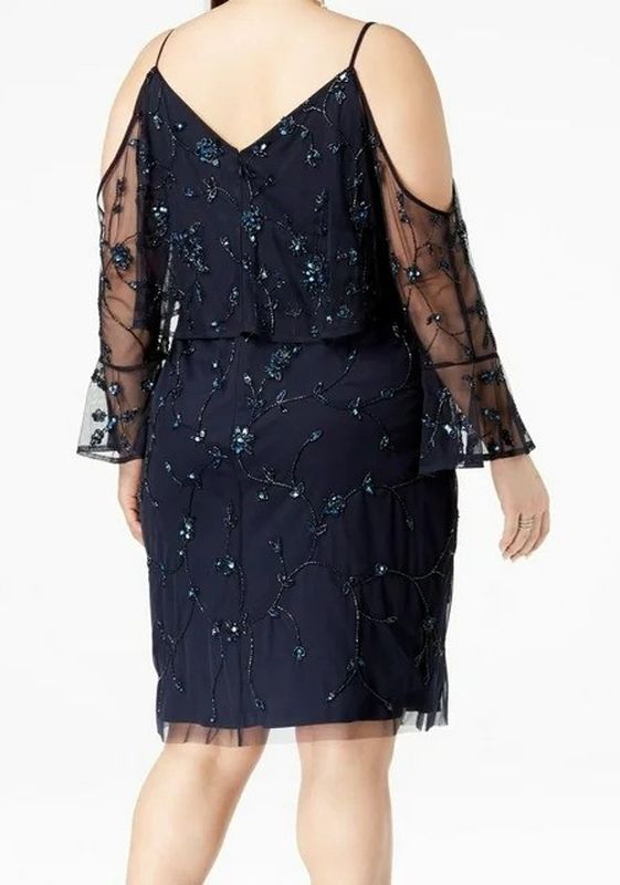Gorgeous Adrianna Papell cold shoulder gown with bell sleeves, all over beaded design, v nack and v back. Perfect for a fashion forward mother of the bride or groom, wedding guest, or just a night out! Cocktail length.