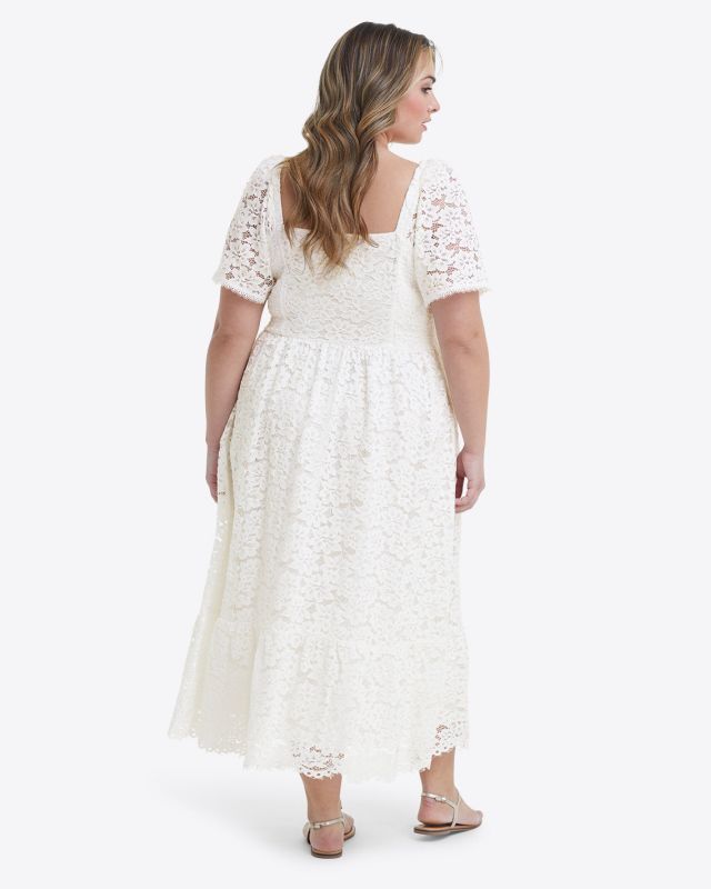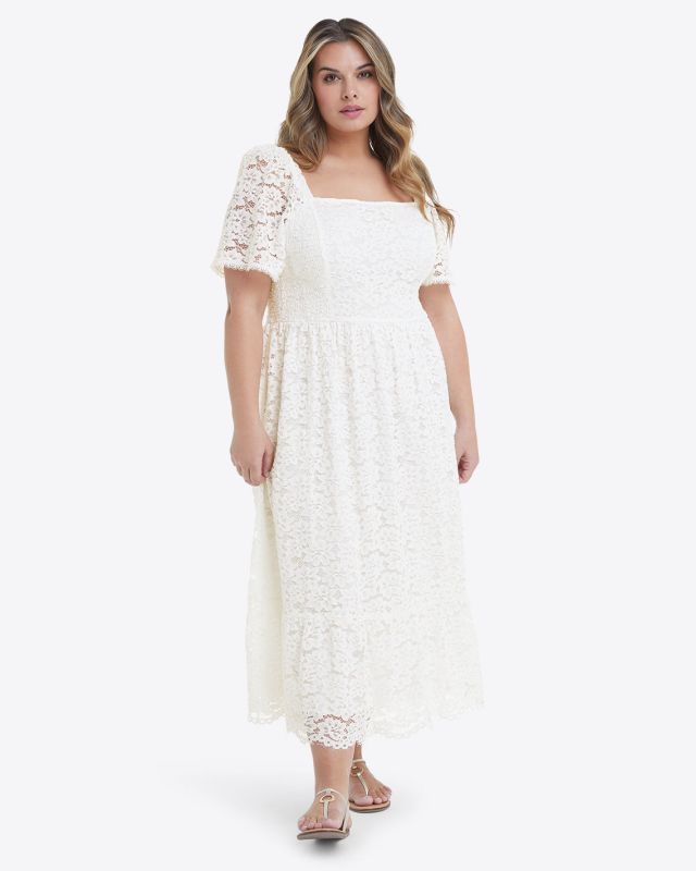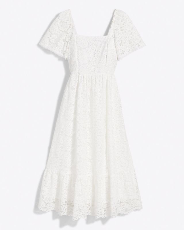 Modern romance. Our Carrie Midi Dress is made from white lace and finished with a stretchy smocked bodice, a flattering square neckline and generous puff sleeves. Obviously, it looks pretty with high-heeled sandals, but you can try it with sneakers, too,