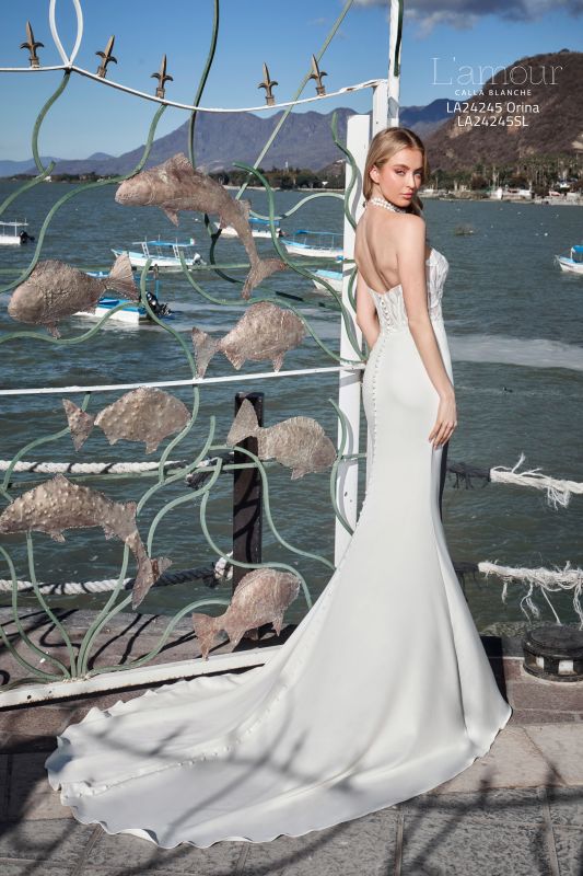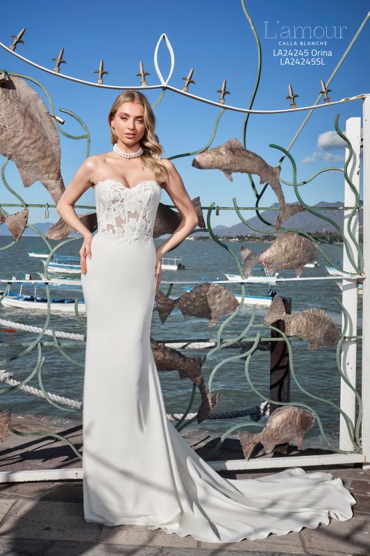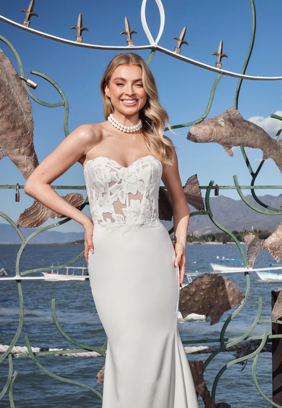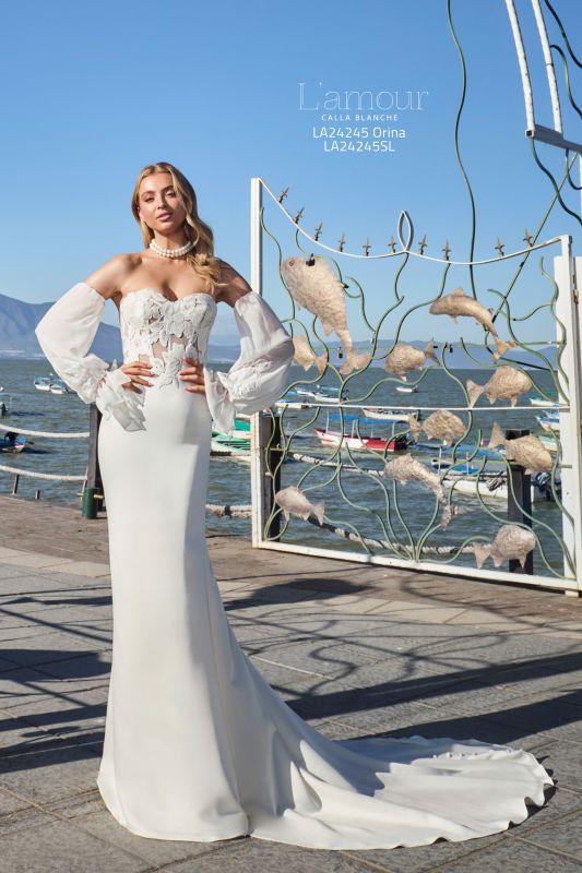 Ideal for the bride who desires a blend of vintage charm and contemporary sophistication, this fitted satin wedding dress features a strapless design that gracefully transitions into an off-the-shoulder design with chiffon puff sleeves (sold separately), adding a whimsical touch to your bridal look. Orina's satin bodice hugs your curves in all the right places and her sleek, ensuring you captivate from every angle all day long. Designed to be a mix of timeless romance and contemporary allure, this gown whispers enchantment with every step you take down the aisle.