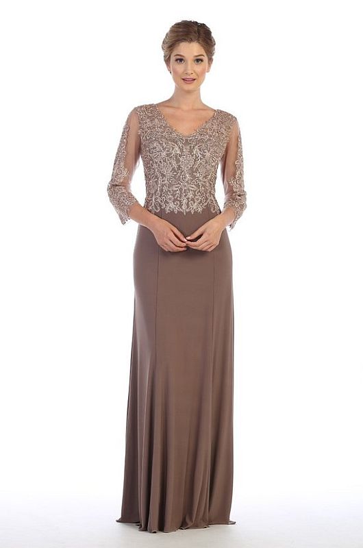 v neck, 3/4 embellished lace sleeves and bodice, a line jersey skirt, zip back. Available S-4XL in Mocha/Mauve, Black, Burgundy, Navy